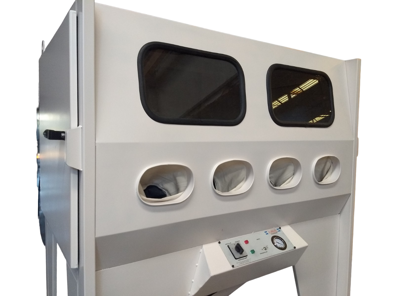 Para piezas de importantes longitudes, Air Blast desarrolla cabinas de succión y presurizadas dobles, las cuales cuentan con 2 posiciones de trabajo independientes, doble ciclón para aspiración y selección de particulas y una batería con filtros a cartucho lavables y antiestáticos.
